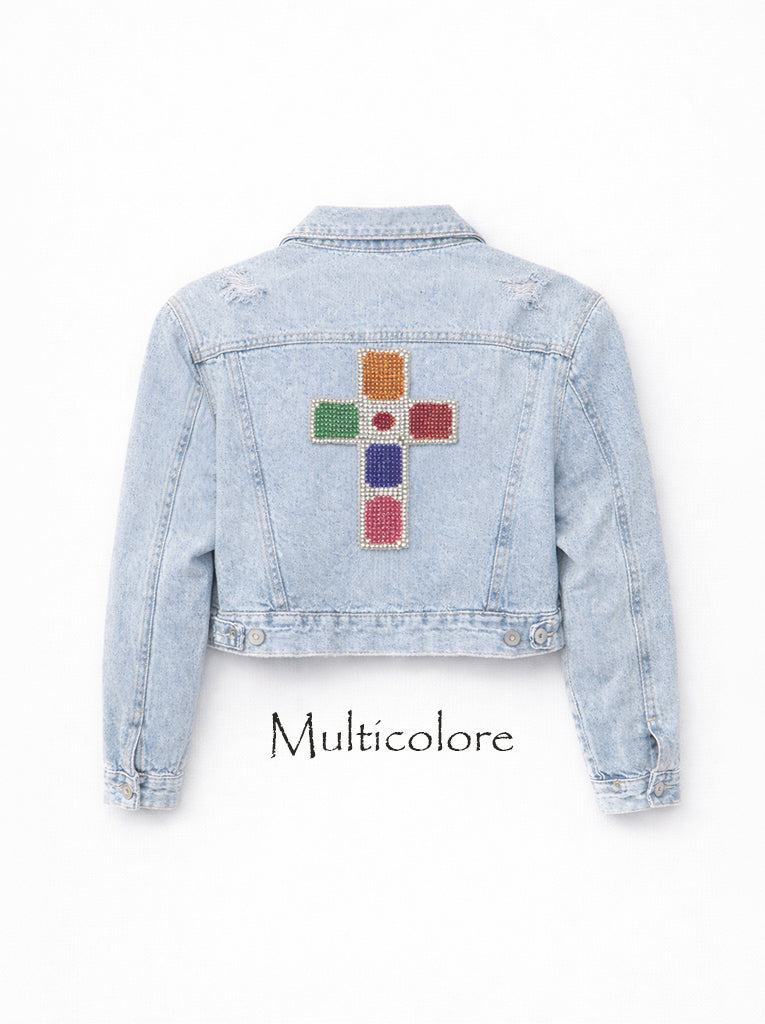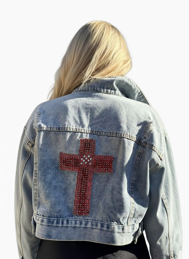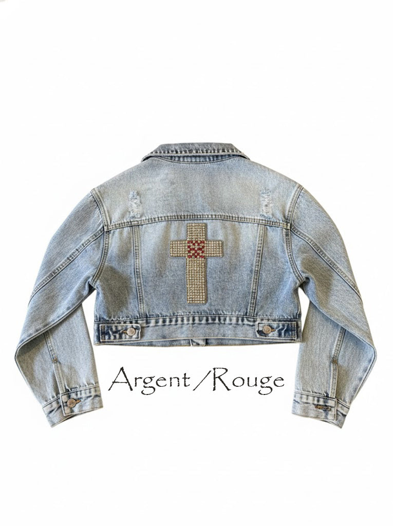 Confectionnée en denim premium, cette veste LIV & CO se distingue par sa croix emblématique, entièrement brodée à la main. Chaque pièce nécessite environ 35 heures de travail artisanal, rendant chaque création unique au monde.